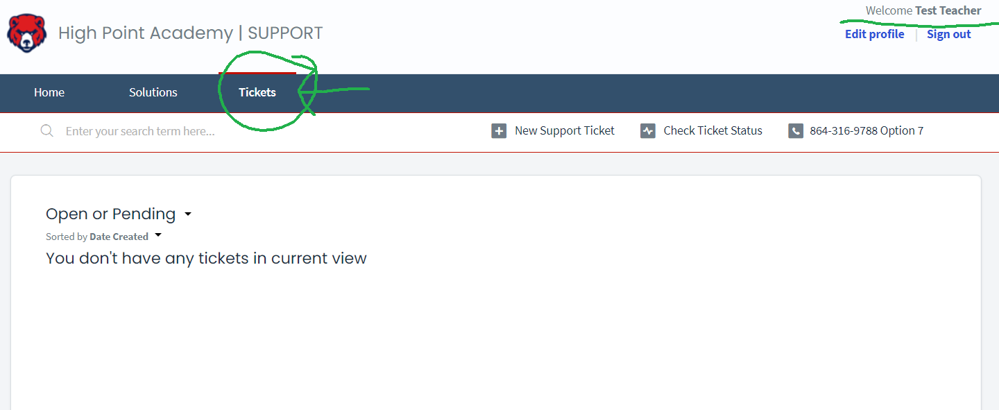 You will now see your personal page, where you can see any current tickets you have open!